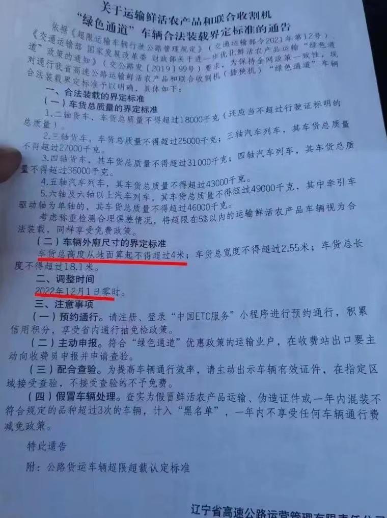 遼寧省高速公路運營管理有限責(zé)任公司于2022年12月1日實施的《關(guān)于運輸鮮活農(nóng)產(chǎn)品和聯(lián)合收割機(jī)“綠色通道”車輛合法裝載界定標(biāo)準(zhǔn)的通告》。受訪者供圖