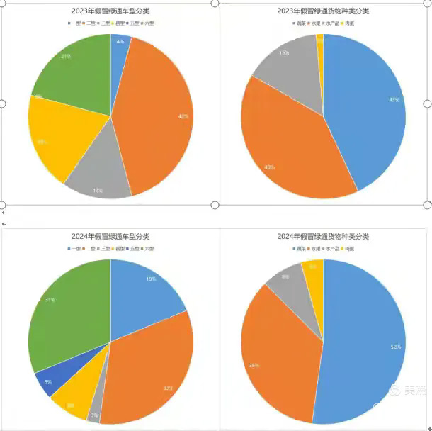 3.自集團(tuán)“綠色通道”車輛專項(xiàng)治理工作要求以來,鄭庵收費(fèi)站精細(xì)化梳理排查假冒綠通類別,針對性強(qiáng)化查驗(yàn)。假冒綠通車型和貨物種類分類如圖: