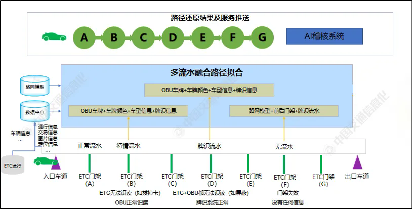 本文針對ETC識讀率低、牌識流水與抓拍率低、假冒減免車輛、套牌、路徑作弊等收費問題,搭建了AI稽核系統(tǒng)平臺,實現(xiàn)了多源異構(gòu)數(shù)據(jù)的采集、存儲、處理與分析。在深度融合ETC門架、收費站等流水和圖像信息的基礎(chǔ)上,提出了多流水融合路徑擬合方法真實還原了通行過程車輛信息,為偷逃漏通行費稽核提供了完整證據(jù)鏈。同時,深度分析了所轄區(qū)域2020年5月至2021年12月間數(shù)據(jù),結(jié)果表明,AI稽核系統(tǒng)模型準(zhǔn)確率較高,可有效防范和遏制偷逃漏通行費行為,提升稽核追繳成功率。