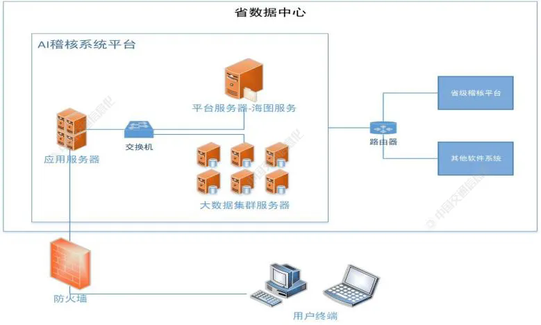 數(shù)據(jù)源是開展收費稽核工作的基礎(chǔ),包括通行、交易、牌識、視頻等采集數(shù)據(jù)和車輛發(fā)行、路網(wǎng)、費率、節(jié)點等基礎(chǔ)數(shù)據(jù),具體如下[8]。1、車道收費數(shù)據(jù)具體包括車道收費交易數(shù)據(jù)和車道牌識數(shù)據(jù),其中車道收費交易數(shù)據(jù)包括出入口站點、出入口時間、車牌、車型、軸重、軸數(shù)、行駛里程、收費金額等;車道收費牌識數(shù)據(jù)包括收費站編號、抓拍時間、識別車牌號、識別車型、抓拍圖片等。2、門架計費數(shù)據(jù)和牌識數(shù)據(jù)具體包括門架計費交易數(shù)據(jù)和門架牌識數(shù)據(jù),其中,門架計費交易數(shù)據(jù)包括入口信息、交易時間、車型、車牌、計費里程、計費金額等;門架牌識數(shù)據(jù)包括門架編號、抓拍時間、識別車牌號、識別車型、拍攝位置、抓拍圖片等。3、發(fā)行數(shù)據(jù)包括ETC和OBU的發(fā)行數(shù)據(jù),具體包括發(fā)行省份、發(fā)行時間、車牌、車型、顏色、圖片、軸數(shù)以及辦理人的相關(guān)信息。4、跨省拆分?jǐn)?shù)據(jù)包括車輛跨省通行的車輛通行數(shù)據(jù)和收費數(shù)據(jù),具體包括車輛通行收費站出入口數(shù)據(jù)、車道交易數(shù)據(jù)、門架計費數(shù)據(jù)等信息。5、全省治超數(shù)據(jù)和治超牌識數(shù)據(jù)主要包括車輛通行數(shù)據(jù)、計重數(shù)據(jù)和牌識數(shù)據(jù),具體包括車輛通行時間、車牌、車型、軸重、軸型、圖片等數(shù)據(jù)。(二) AI稽核系統(tǒng)設(shè)計思路1、AI稽核網(wǎng)絡(luò)拓?fù)銩I稽核系統(tǒng)采用了大數(shù)據(jù)集群服務(wù)器、地圖引擎服務(wù)器、應(yīng)用服務(wù)器,網(wǎng)絡(luò)拓?fù)淙鐖D2所示。其中,大數(shù)據(jù)集群服務(wù)器主要對收費數(shù)據(jù)、發(fā)行數(shù)據(jù)、拆分?jǐn)?shù)據(jù)、治超數(shù)據(jù)、牌識數(shù)據(jù)接收、存儲以及對稽核模型、路徑還原等進(jìn)行計算,還能通過倒排索引對數(shù)據(jù)進(jìn)行高性能檢索;地圖引擎服務(wù)器主要實現(xiàn)地圖圖層加載、路網(wǎng)模型計算;應(yīng)用服務(wù)器主要實現(xiàn)對AI稽核系統(tǒng)的部署和接口的數(shù)據(jù)交互。