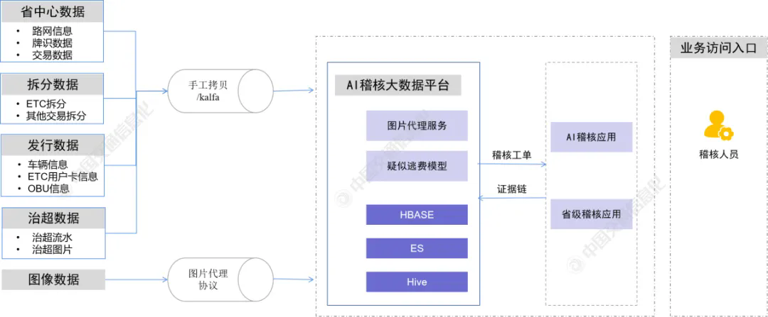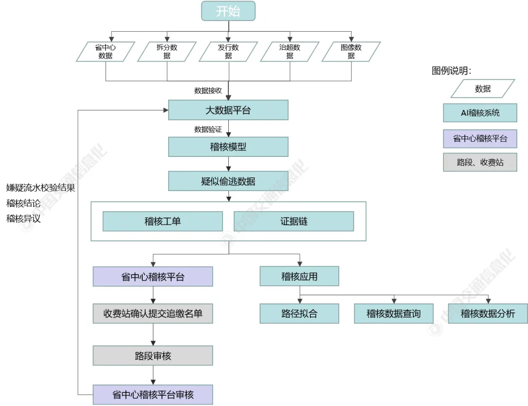 同時,鑒于數(shù)據(jù)存儲介質(zhì)、數(shù)據(jù)存儲類型和數(shù)據(jù)傳輸方式的差異,通過不同工具實現(xiàn)異源、異構(gòu)數(shù)據(jù)的導(dǎo)入。其中,對實時性要求較高的監(jiān)測數(shù)據(jù)以分布式消息隊列的形式由Kafka分發(fā);關(guān)系型數(shù)據(jù)庫由Sqoop等工具直接將數(shù)據(jù)導(dǎo)入HDFS;非實時性數(shù)據(jù)選擇MapReduce計算引擎,實時性要求較高的數(shù)據(jù)選擇Spark或Storm計算框架。3、AI稽核系統(tǒng)流程AI稽核系統(tǒng)流程如圖4所示,可分為4個步驟:(1)省中心數(shù)據(jù)、拆分?jǐn)?shù)據(jù)、治超數(shù)據(jù)、發(fā)行數(shù)據(jù)等接收匯聚至大數(shù)據(jù)平臺,通過稽核模型數(shù)據(jù)驗證,得到疑似偷逃費數(shù)據(jù);(2)系統(tǒng)根據(jù)疑似偷逃費數(shù)據(jù),自動匹配生成稽核工單和證據(jù)鏈,并推送至省中心稽核平臺及稽核應(yīng)用;(3)省中心稽核平臺將稽核工單和證據(jù)鏈推送至收費站,一線稽核人員確認(rèn)后提交追繳工單,工單提交至路段和省中心進(jìn)行審核;(4)省中心稽核平臺審核完畢后,生成追繳名單,并反饋校驗結(jié)果、稽核結(jié)論等至AI稽核系統(tǒng)。