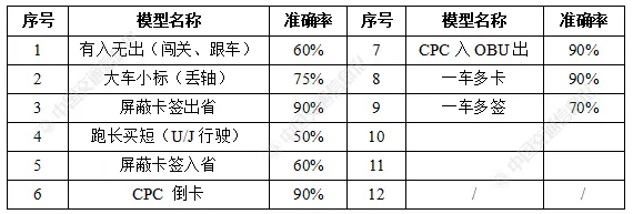 (四)稽核模型建立與準(zhǔn)確率驗證本文所述AI稽核系統(tǒng)根據(jù)不同逃費類型建立對應(yīng)模型,目前已實現(xiàn)大車小標(biāo)、有入無出、屏蔽卡簽入省、屏蔽卡簽出省、跑長買短、CPC倒卡、CPC入OBU出、一車多卡、一車多簽等近10種偷逃費行為稽核。以大車小標(biāo)偷逃費行為進(jìn)行舉例說明。改變車型(車種):大車小標(biāo)是指發(fā)行車型跟實際車型不符。通過非法手段辦理或套取使用與實際車型不符的車輛標(biāo)簽,達(dá)到偷逃費的目的?;藬?shù)據(jù)驗證方式如下:(1)通過交易數(shù)據(jù)中的車牌、車牌顏色和車型與發(fā)行數(shù)據(jù)對比,確定大車小標(biāo);(2)利用入口稱重數(shù)據(jù),在收費數(shù)據(jù)中的入口交易數(shù)據(jù)搜索軸數(shù)與車型不符的車輛;(3)搜索收費數(shù)據(jù)中的入口交易數(shù)據(jù),車型為一型貨車,且車牌顏色為黃色的車輛;(4)篩選車輛通過ETC專道和人工車道的收費車型存在不一致的情況,通過車牌號篩選某個車牌多次出現(xiàn)兩個及以上的車型的車輛;(5)對篩選出的車輛,根據(jù)大數(shù)據(jù)平臺圖片、交易數(shù)據(jù),對特征點進(jìn)行對比分析,形成初步結(jié)論。通過對稽核模型分析數(shù)據(jù)與稽核人員核實數(shù)據(jù)對比分析,進(jìn)行稽核模型分析篩查準(zhǔn)確率驗證,稽核模型準(zhǔn)確率如表2所示。屏蔽卡簽、倒卡通行介質(zhì)等稽核模型準(zhǔn)確率較高,達(dá)90%,有入無出(闖關(guān)、跟車)、跑長買短(U/J行駛)因系統(tǒng)及計費規(guī)則、現(xiàn)場管理和證據(jù)獲取等多重因素影響,準(zhǔn)確率為50%~60%左右,但能夠滿足稽核業(yè)務(wù)需求?;四P蜏?zhǔn)確率如表2所示。